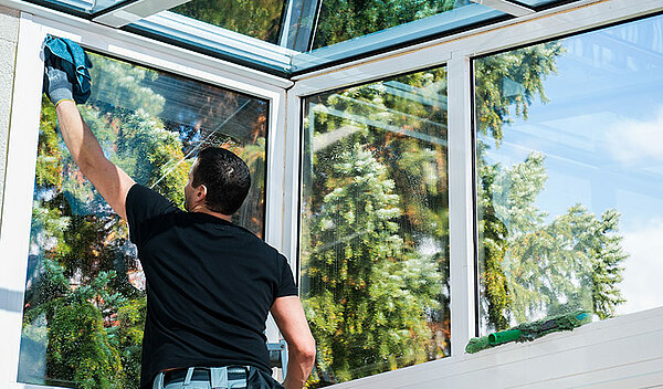 Bei Glasflächen im Außenbereich erhalten wir ein streifenfreies Ergebnis durch den Einsatz von umweltfreundlichem, entmineralisiertem Leitungswasser. Glasflächen und Rahmen werden in einem Arbeitsgang gereinigt.